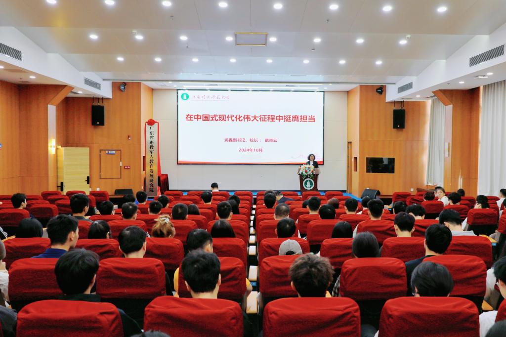 会后,戴青云校长为退役士兵大学生代表讲授题为《在中国式现代化伟大征程中挺膺担当》的思政课。她从党的二十届三中全会的时代意义,党的二十届三中全会深远历史影响和青年大学生的使命担当等三个部分出发,勉励退役士兵大学生要紧跟时代步伐,厚植爱国主义情怀,在增强综合素质上下功夫,充分利用学校建立广东省退役军人教育发展研究院的优势资源,结合专业实际,不断提升自身政治素养和专业能力,做德智体美劳全面发展的社会主义建设者和接班人,在推进强国建设、民族复兴伟业中展现青春作为、彰显青春风采、贡献青春力量,奋力书写为中国式现代化挺膺担当的青春篇章。