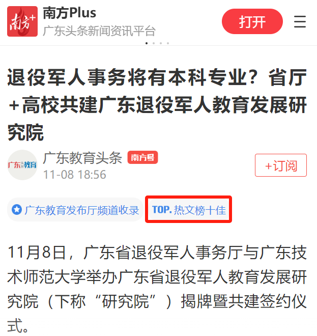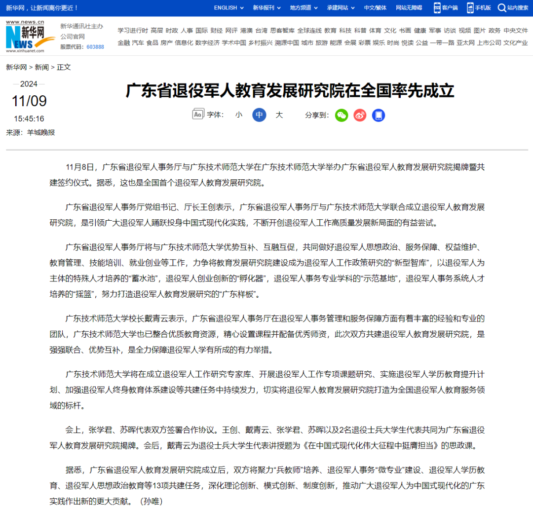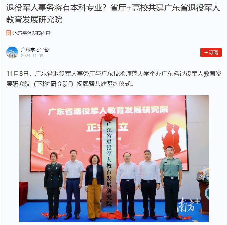 近日,广东省退役军人教育发展研究院宣告成立,受到社会各界广泛关注,《学习强国》《新华网》《南方网》《凤凰网》、中国退役军人官微等国内知名媒体争相报道,并获《南方+》广东教育头条热文榜十佳,说明成立广东省退役军人教育发展研究院是顺应时代发展,是国家所需、人民所需、时代所需的光荣的事业。